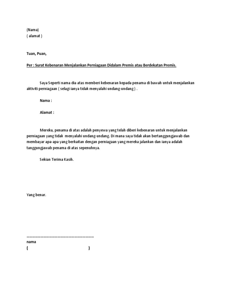 Contoh Surat Kebenaran Menggunakan Premis Perniagaan Jaycectzx