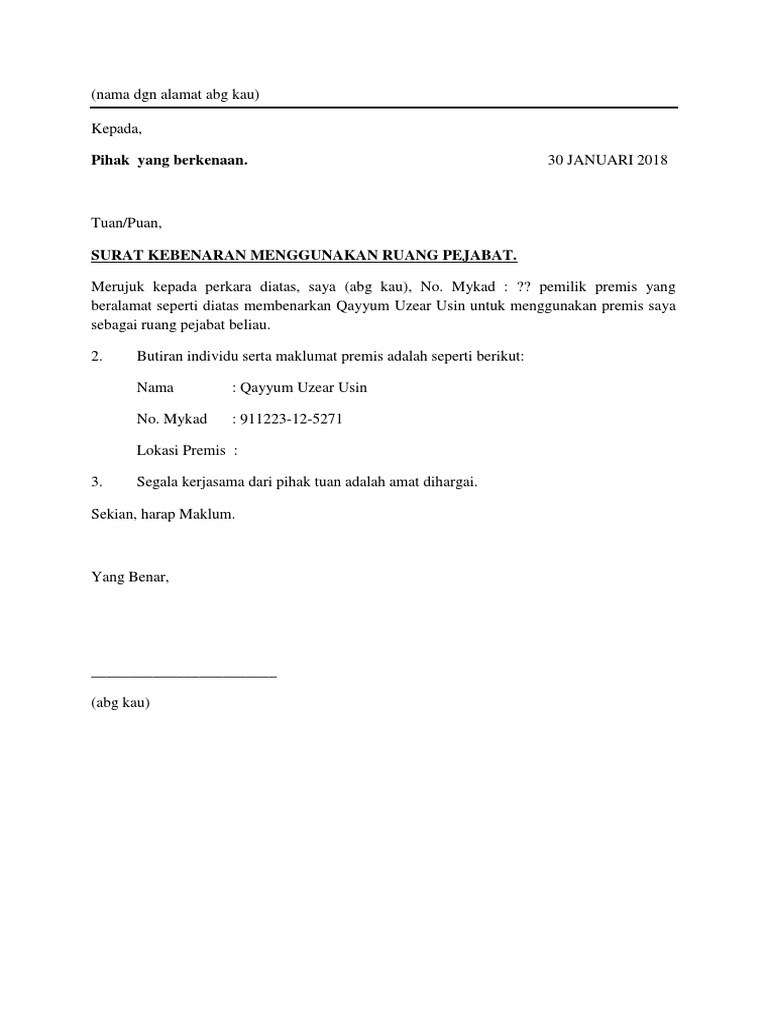 Contoh Surat Kebenaran Menggunakan Alamat Kediaman Sebagai Alamat Berdaftar Kelab Pdf